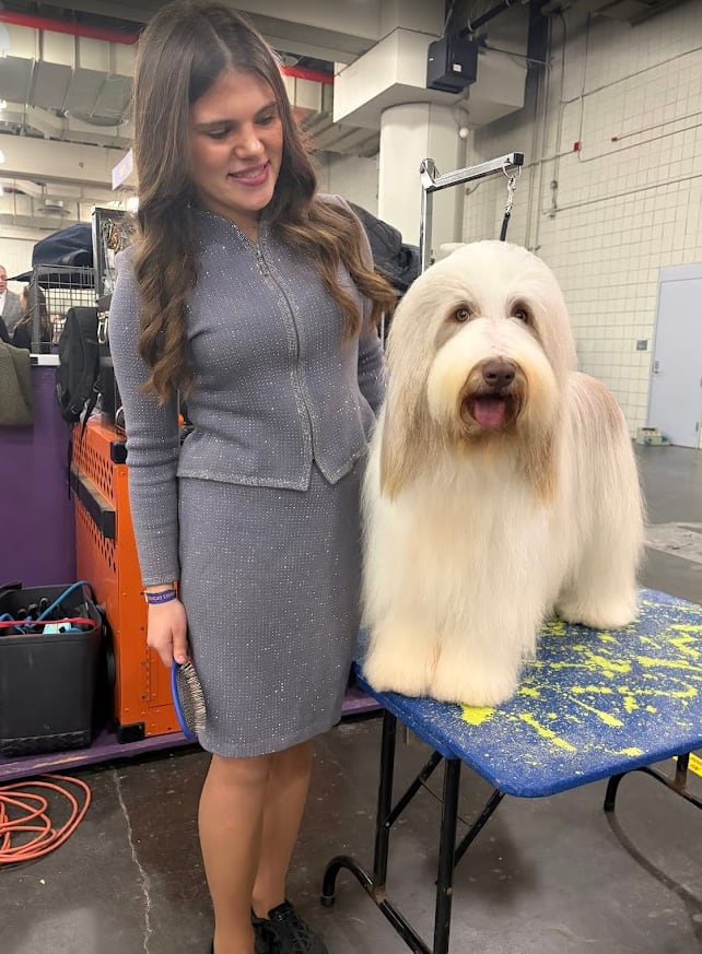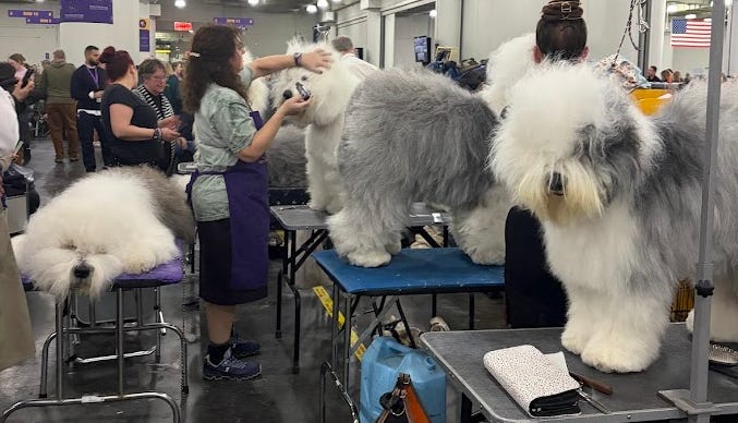 One thing I noticed about handlers is that many of they wear a lot of sparky clothing. One handler about it and she said this was traditional style for winter shows and that most handlers buy these designer two-piece suits from St. Johns, where the price tag hovers around $2000 for a suit.