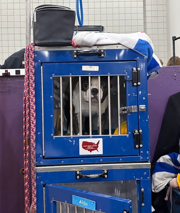 So, I went into Madison Square Garden rooting for the Doberman. But then, soon after the show started, I admit my eyes sort of glazed over. We were probably sixty feet above the action, and surrounded by more TVs than you find at a sports bar. It reminded me of the last time I went to a baseball game: There was a lot of green to look at. Except instead of men in tight pants catching balls on a green expanse, it was mostly women in sequins trotting around with breeds of dogs I’d never heard of. There was no announcer like there is when you watch on TV. So, it all seemed like a bit of a blur. When Rosie (who was strapped to me) and I went to go drop $23 on a to-go burger, I was pretty sure I wouldn’t regret missing something.