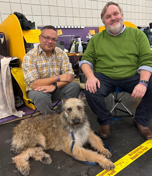 In the holding area at the Javits Center, I also met Chris Nelson, who helped advise Lili on Dogs Of The World. Chris got interested in dog breeds when he was in middle school and his parents got him a CD-Rom about dog breeds. It became an obsession. His first visit to Westminster was a high school graduation gift from his family in 2009. Chris announces shows all around the country, and aspires to one day announce at Westminster. I asked him to pick a breed at random and pretend he was announcing them at Westminster.
