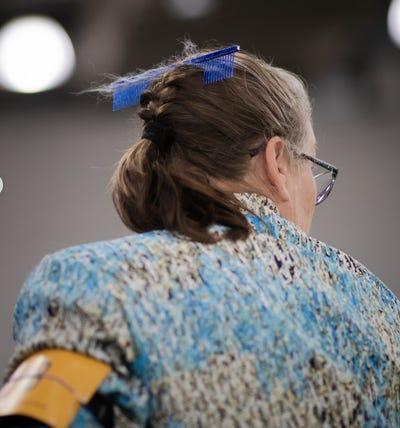 Many of the handlers also accessorize with a color coordinated comb in their hair, I suppose for last minute dog primping. They poke them into the top of their ponytails or braids, parallel to their shoulders. The first person I saw with this do, I thought they must’ve gotten distracted while getting ready. But then I saw another, and another.