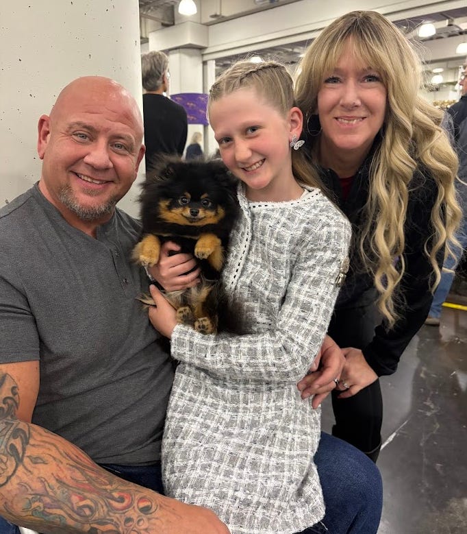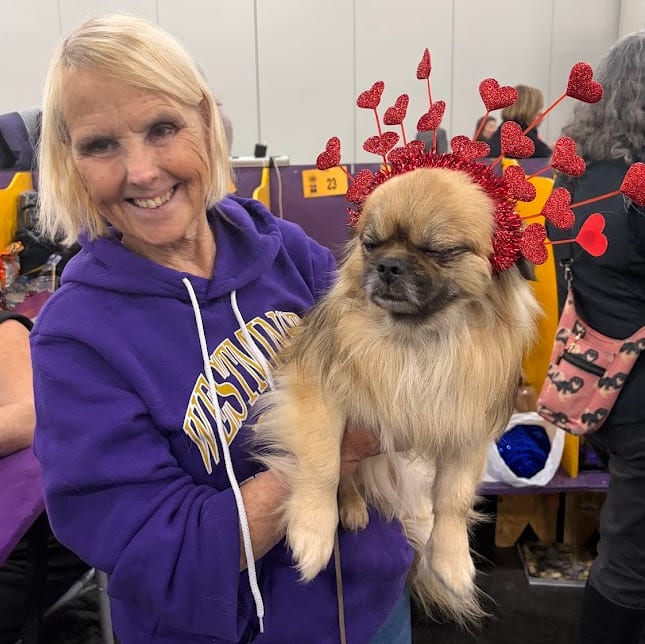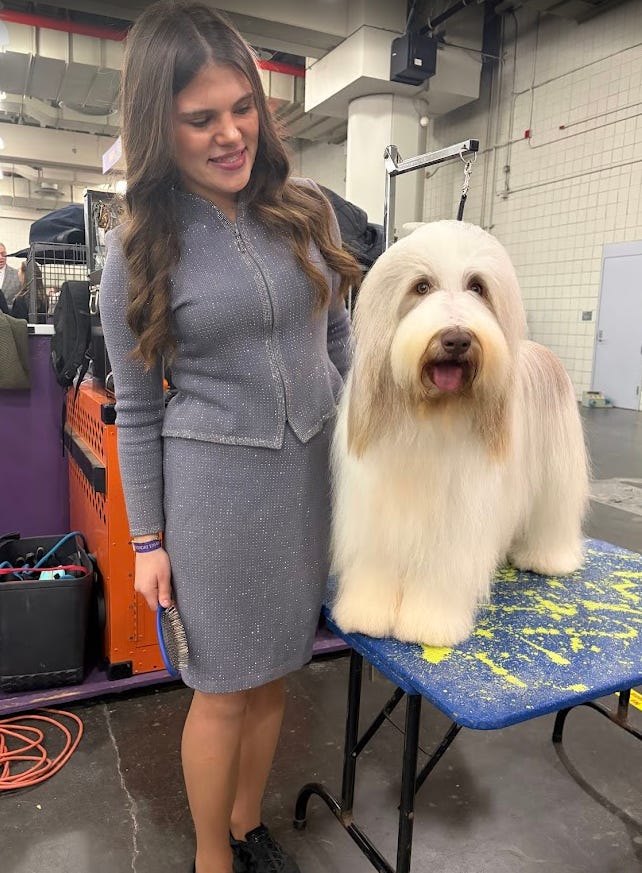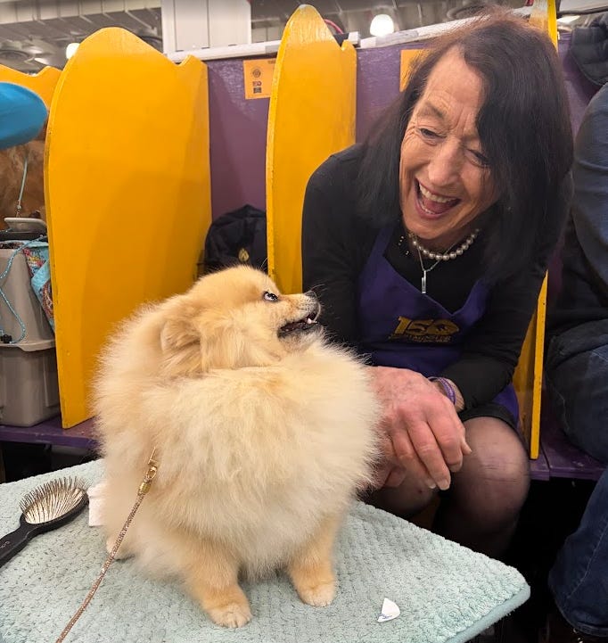 At these shows, the breeder is the unseen hero (or antihero, depending on your point of view), as they’re the ones figuring out how to create a dog with the right size foreface. But the people who get more visibility are the handlers. The day before the Madison Square Garden event, where the Best in Breed and Best in Show judgings were held, I went to the Javits Center, where the breeds compete against each other in the daytime hours. There, I met a handler named Christa Cook, who is based near St. Louis and is a Westminster veteran — in 2019, she handled the first Schipperke to ever win the Non-Sporting Group. She was there with several dogs, including Jake, a Chinese Crested who ended up with an Award of Merit for the breed (basically a runner up). She told me she is one of about three hundred professional handlers. Owners find her, often through the breeder they bought their dog from, then bring the dog to her for evaluation, and, if she deems them worthy, she brings them to these shows all over the country. She attends nearly 200 shows a year. Here she is, giving me a little rundown of how it all works, and why she things selecting dogs by their looks is a good idea: